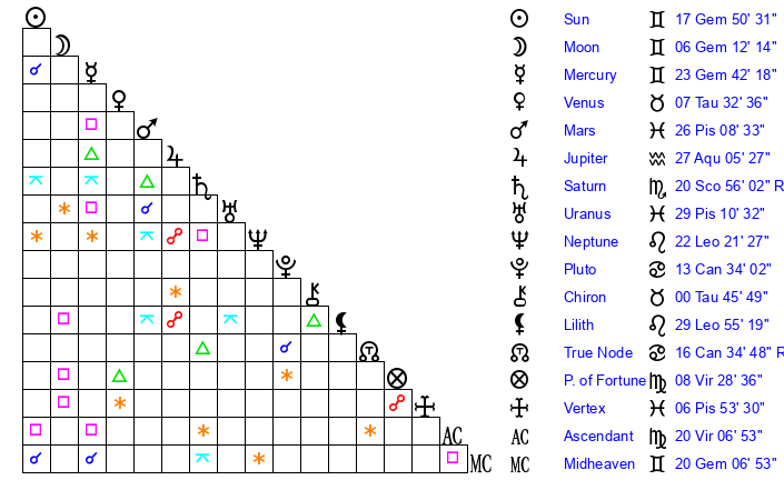 | Sun | 17 Gemini 50 | 18 Gemini 52 | 22 Virgo 49 |