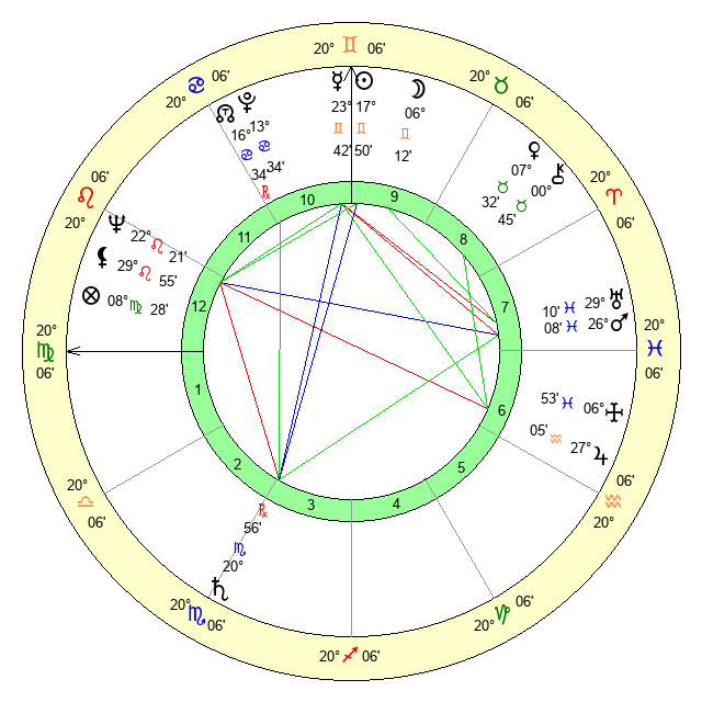 | Moon | 6 Gemini 3 | 28 Scorpio 2 | 8 Capricorn 42 |