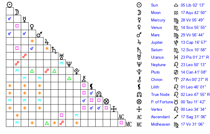 | Moon | 17 Aquarius 45 | 21 Sagittarius 31 | 8 Libra 41 |