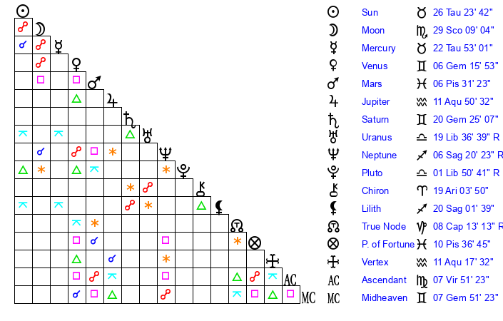 | Sun | 26 Taurus 23 | 26 Taurus 48 | 16 Cancer 8 |