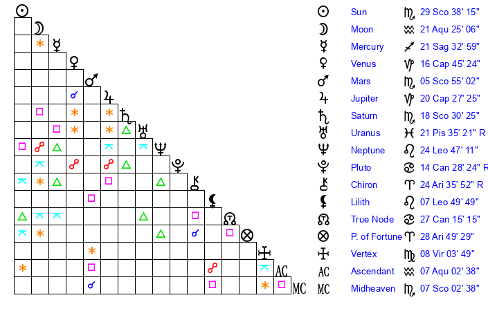 | Sun | 29 Scorpio 38 | 0 Sagittarius 38 | 10 Pisces 7 |