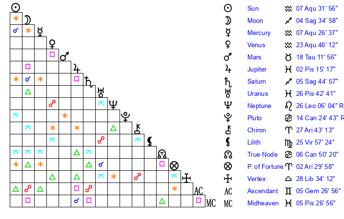 | Saturn | 6 Sagittarius 10 | 16 Pisces 58 | 6 Sagittarius 17 |