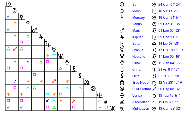 | Moon | 10 Virgo 17 | 21 Aries 6 | 5 Gemini 15 |