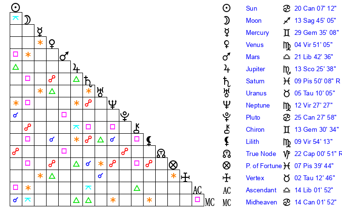 | Neptune | 12 Virgo 27 | 2 Aries 9 | 15 Virgo 30 |