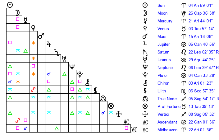 | Sun | 4 Aries 59 | 6 Aries 17 | 17 Cancer 22 |