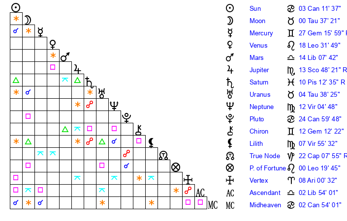 | Moon | 0 Taurus 34 | 8 Cancer 1 | 16 Leo 0 |