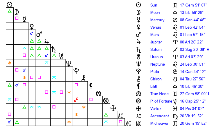 | Moon | 13 Libra 56 | 1 Sagittarius 2 | 19 Taurus 58 |