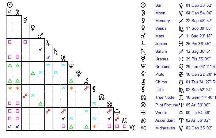| Saturn | 13 Sagittarius 1 | 13 Pisces 56 | 19 Sagittarius 30 |