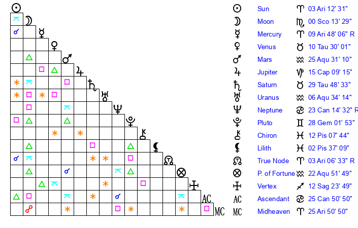 Mercury | 9 Aries 47 | 4 Aries 44 | 16 Leo 14 |
