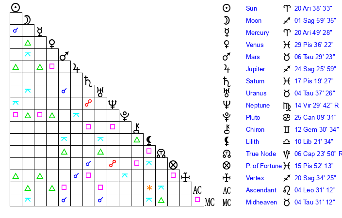 | Sun | 20 Aries 38 | 21 Aries 4 | 16 Cancer 18 |