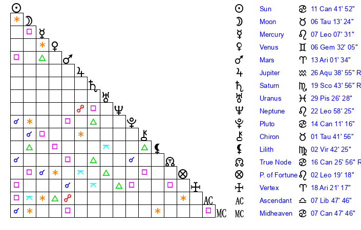 | Saturn | 20 Scorpio 15 | 1 Aries 45 | 24 Scorpio 25 |