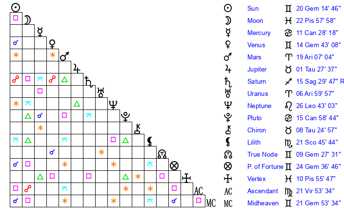 | Moon | 22 Pisces 51 | 22 Sagittarius 23 | 21 Libra 19 |