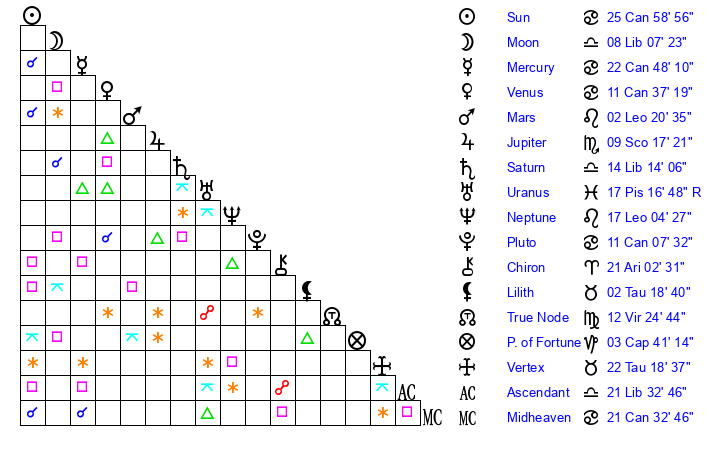 | Venus | 11 Cancer 37 | 16 Gemini 52 | 18 Scorpio 7 |
