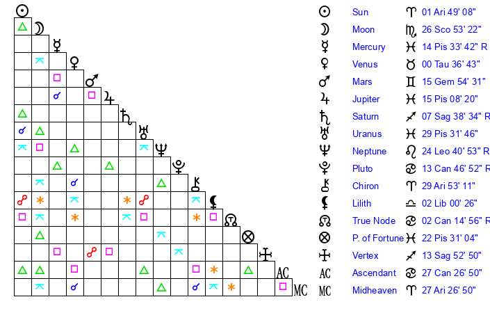 | Pluto | 13 Cancer 47 | 3 Aquarius 24 | 15 Cancer 14 |
