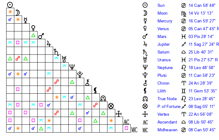 | Moon | 14 Virgo 15 | 5 Sagittarius 57 | 3 Gemini 23 |
