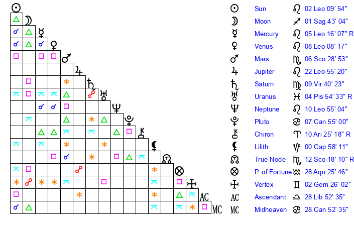 | Mercury | 5 Leo 16 | 13 Leo 29 | 1 Sagittarius 55 |