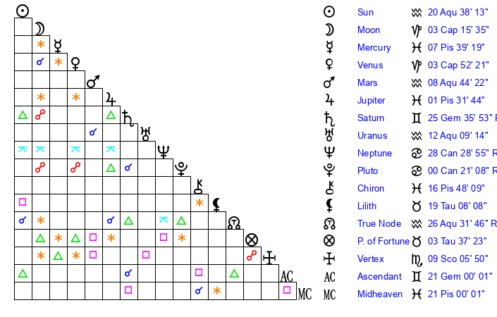| Sun | 20 Aquarius 38 | 21 Aquarius 57 | 8 Gemini 54 |