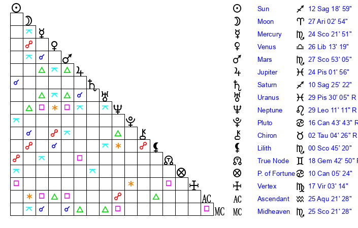 | Moon | 27 Aries 13 | 3 Aquarius 40 | 15 Scorpio 57 |