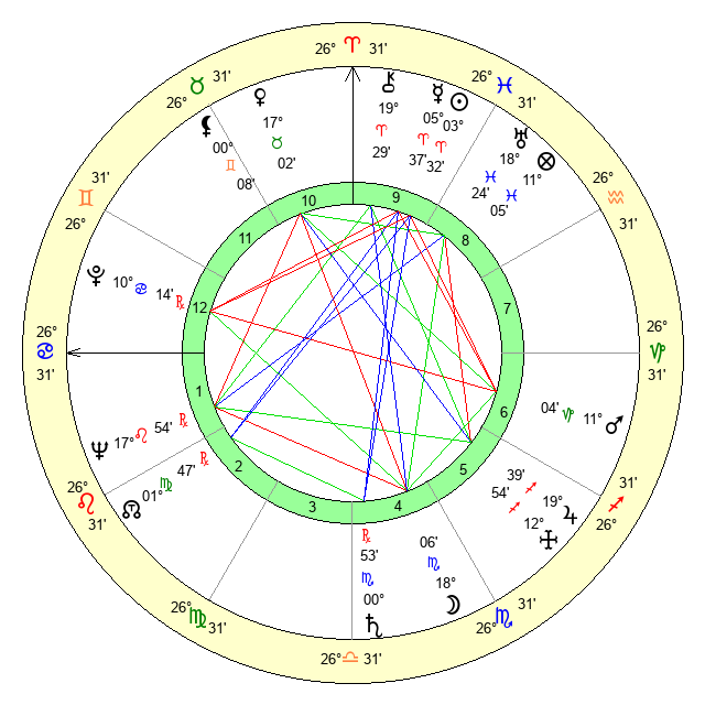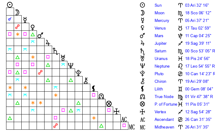 | Sun | 3 Aries 32 | 4 Aries 3 | 11 Cancer 12 |