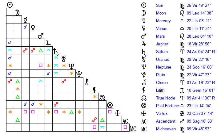 Moon | 9 Leo 12 | 19 Leo 25 | 8 Virgo 3 |