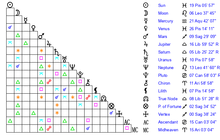 | Sun | 19 Pisces 6 | 20 Pisces 7 | 29 Gemini 16 |