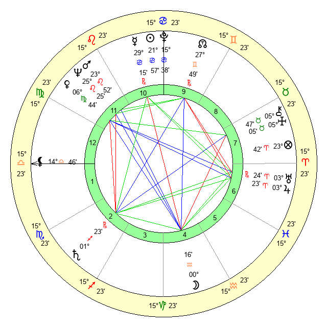 | Sun | 21 Cancer 57 | 23 Cancer 13 | 27 Libra 3 |
