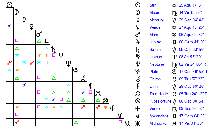 | Moon | 14 Virgo 12 | 20 Virgo 25 | 29 Aquarius 4 |