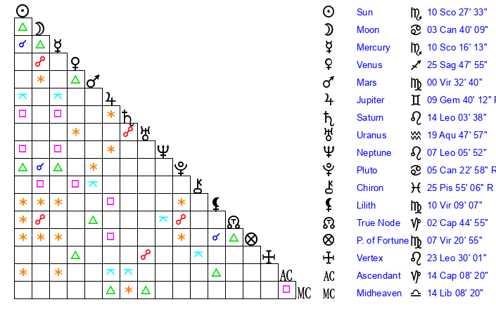| Sun | 10 Scorpio 27 | 11 Scorpio 16 | 0 Pisces 0 |