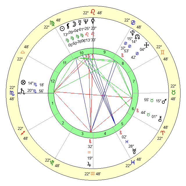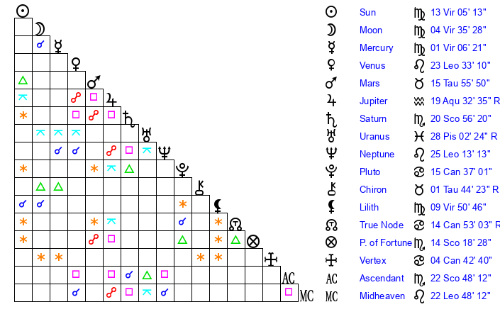 | Sun | 13 Virgo 5 | 14 Virgo 7 | 21 Sagittarius 43 |