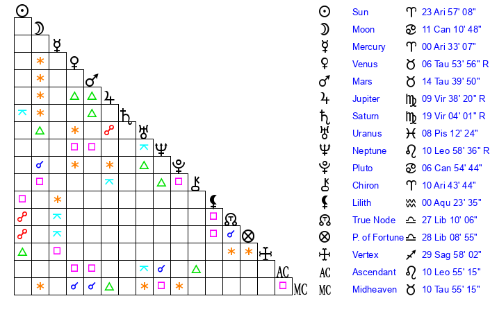 | Sun | 23 Aries 57 | 24 Aries 45 | 3 Leo 50 |