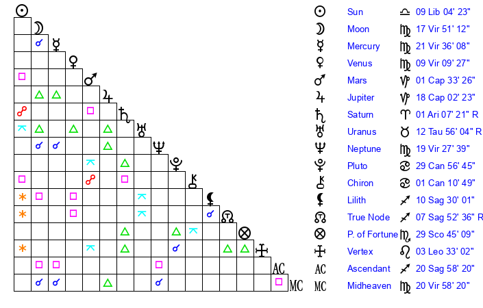 | Neptune | 19 Virgo 27 | 0 Aries 29 | 21 Virgo 8 |