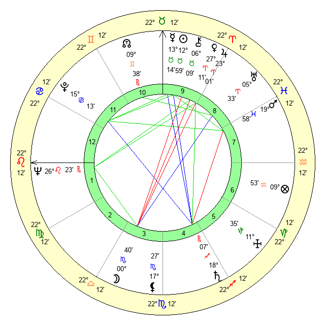 | Moon | 0 Scorpio 36 | 3 Leo 9 | 15 Taurus 32 |