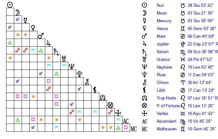 | Moon | 3 Taurus 13 | 29 Aquarius 5 | 20 Sagittarius 54 |