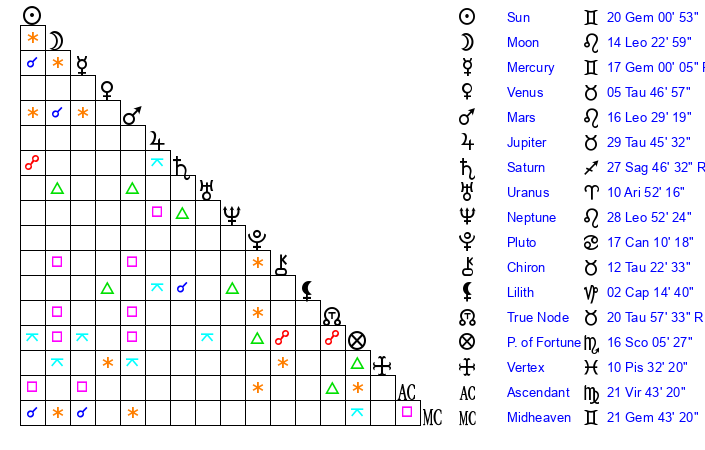 | Moon | 14 Leo 28 | 22 Sagittarius 23 | 11 Aquarius 28 |