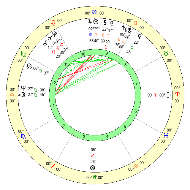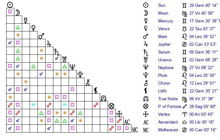 | Sun | 29 Gemini 40 | 0 Cancer 34 | 19 Virgo 17 |