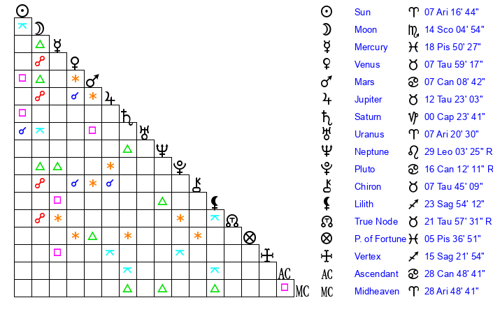 | Moon | 13 Scorpio 59 | 24 Pisces 3 | 8 Taurus 52 |