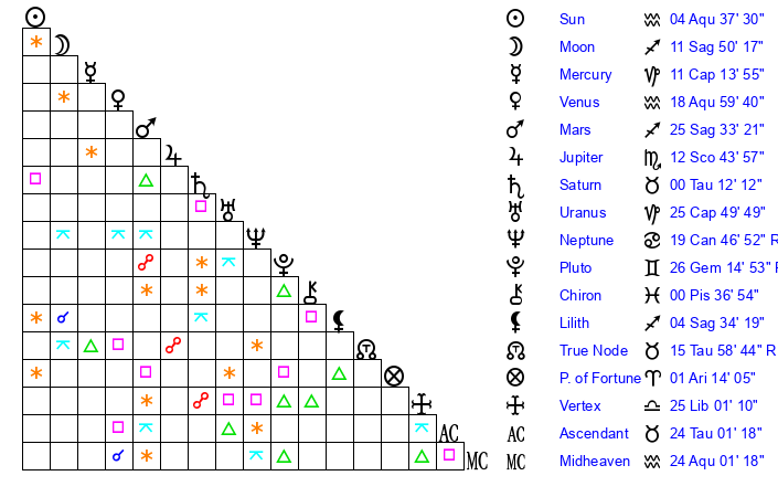 Sun | 4 Aquarius 38 | 5 Aquarius 59 | 27 Taurus 35 |