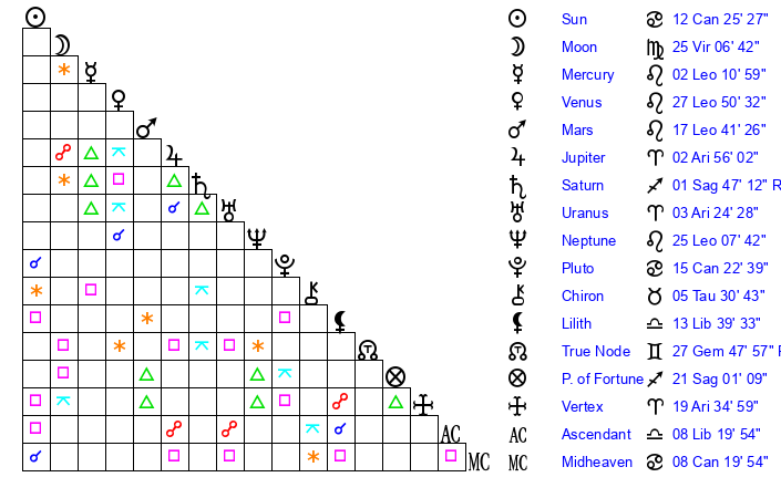 | Moon | 25 Virgo 12 | 12 Scorpio 32 | 25 Aries 11 |