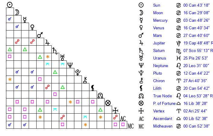| Sun | 0 Cancer 43 | 1 Cancer 31 | 7 Libra 0 |