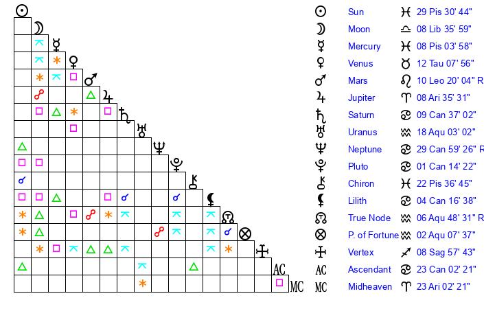 | Neptune | 29 Cancer 59 | 29 Pisces 37 | 1 Leo 44 |