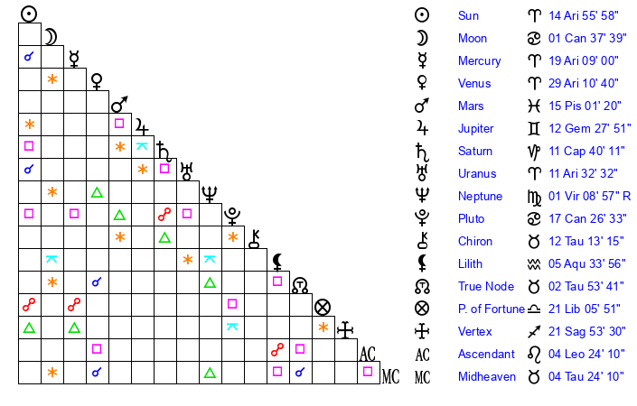 | Venus | 29 Aries 11 | 25 Pisces 48 | 23 Leo 54 |