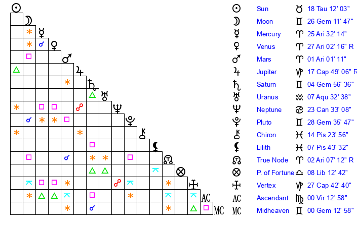 | Sun | 18 Taurus 12 | 19 Taurus 5 | 5 Virgo 29 |