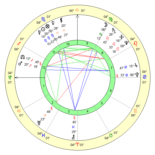 | Moon | 6 Virgo 13 | 3 Aquarius 42 | 5 Leo 19 |