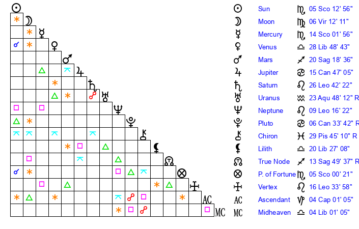 | Sun | 5 Scorpio 13 | 6 Scorpio 16 | 23 Aquarius 42 |