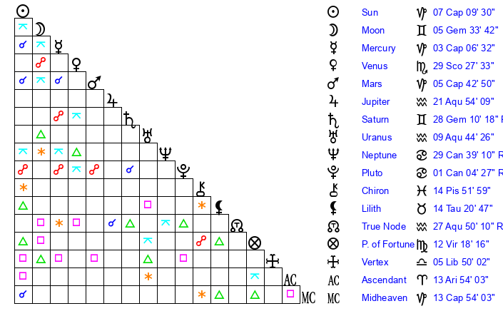 | Moon | 5 Gemini 33 | 23 Sagittarius 43 | 13 Gemini 49 |