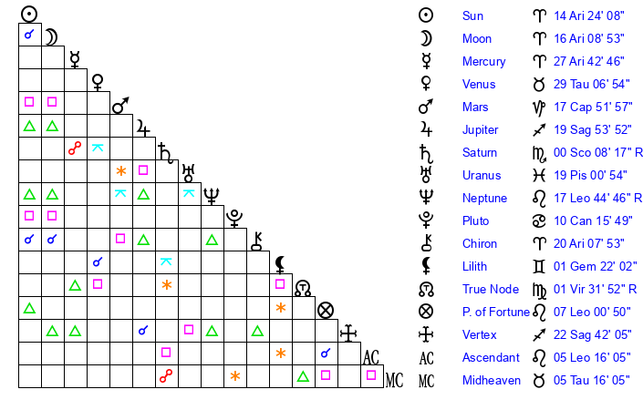 | Sun | 14 Aries 24 | 14 Aries 56 | 21 Cancer 42 |