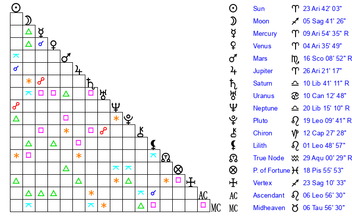 | Pluto | 19 Leo 9 | 3 Aquarius 42 | 19 Leo 47 |