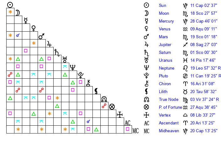 | Moon | 18 Scorpio 38 | 17 Aquarius 5 | 25 Cancer 7 |