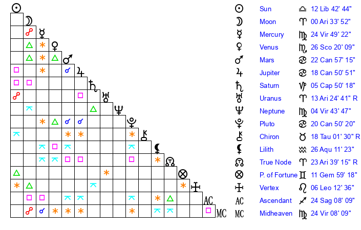 | Moon | 0 Aries 41 | 7 Aries 24 | 28 Virgo 43 |