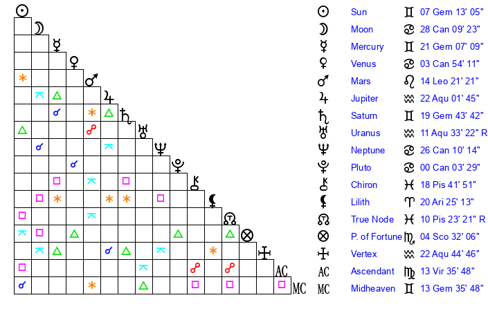 | Sun | 7 Gemini 13 | 8 Gemini 20 | 23 Virgo 42 |